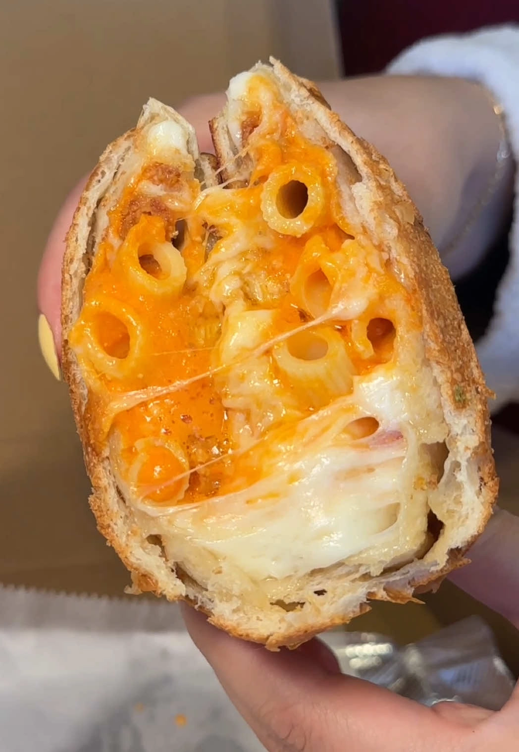 Once sliced in half, the interior exposes a delightful cross-section of penne, melted cheese, and bright orange vodka sauce, creating a visual feast that precedes a sensory explosion of flavors upon the first bite.