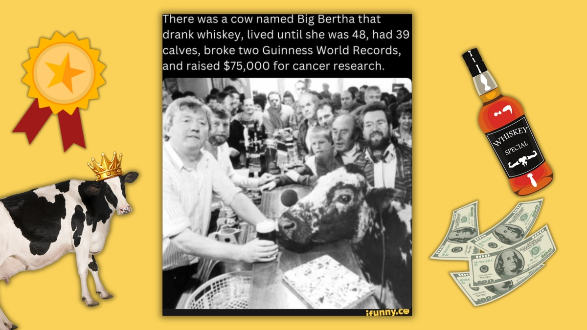 For many years, a tale circulated on social media about a cow named Big Bertha who supposedly drank whiskey, lived to 48 years of age, gave birth to 39 calves, set two Guinness World Records, and raised $75,000 for cancer research.