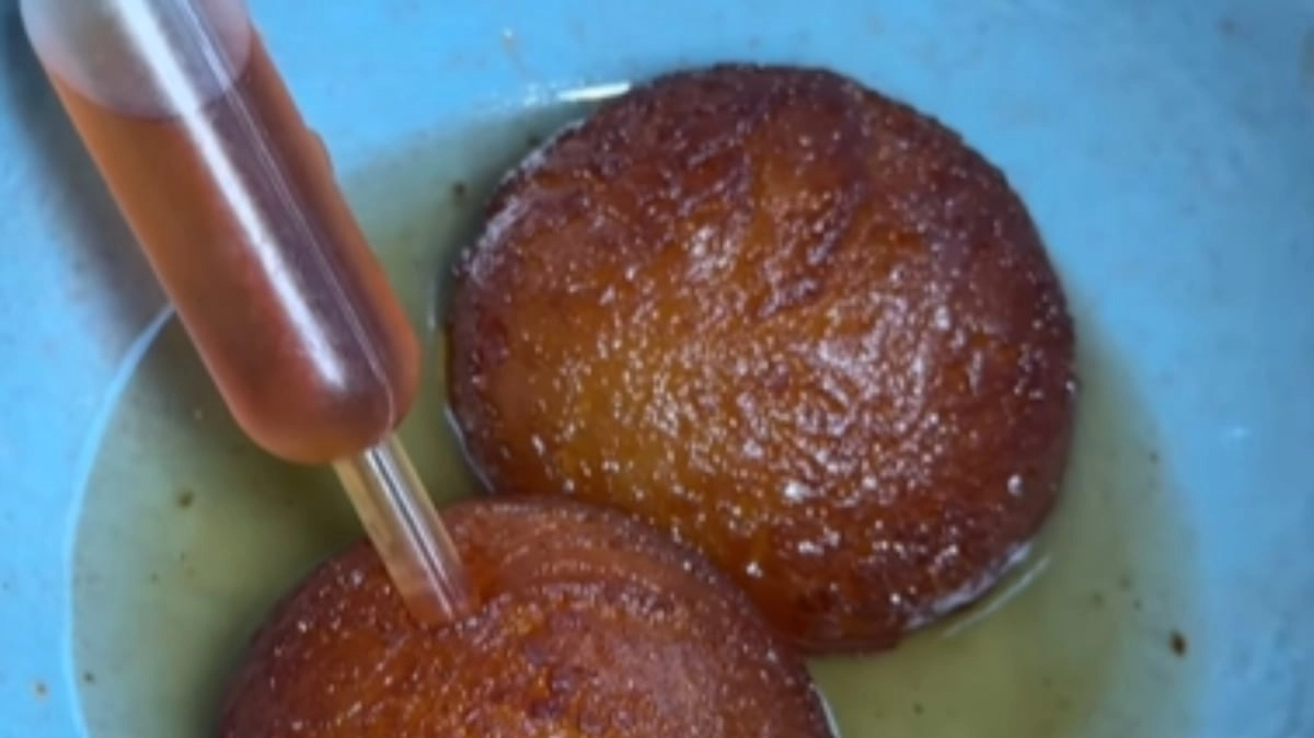 The video began with a close-up of two pieces of Gulab Jamun nestled in a bowl, generously drenched in sugar syrup. It showcased a restaurant staff member adding what appeared to be rum to the delectable dessert.