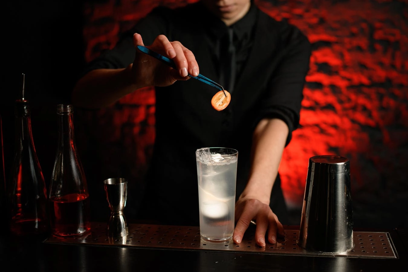 A captivating cocktail boasting a vibrant hue and a unique garnish that exudes a blend of playfulness and mystique.