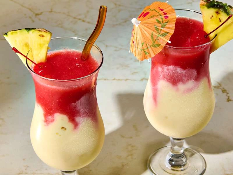- Assemble the Cocktails: Pour the strawberry mixture over the banana base gently to create the layered "lava" effect. Garnish with pineapple slices and maraschino cherries if desired, then serve immediately with a straw.